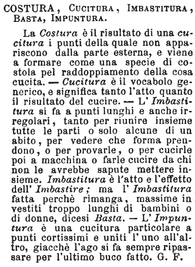 | Costura, Cucitura, Imbastitura, Basta, Impuntura - La Costura è il risultato di una cucitura i punti della quale non appariscono dalla parte esterna, e viene a formare come una specie di costola pel raddoppiamento della cosa cucita. - Cucitura è il vocabolo generico, e significa tanto l'atto quanto il risultato del cucire. - L'imbastitura si fa a punti lunghi e anche irregolari, tanto per riunire insieme tutte le parti o solo alcune di un abito, per vedere che forma prendono, o per provarle, o per cucirle poi a macchina o farle cucire da chi non le avrebbe sapute mettere insieme. Imbastitura è l'atto e l'effetto dell'Imbastire; ma l'Imbastitura fatta perchè rimanga, massime in vestiti troppo lunghi di bambini o di donne, dicesi Basta. - L'Impuntura è una cucitura particolare a punti cortissimi e uniti l'uno all'altro, giacchè l'ago si fa sempre ripassare per l'ultimo buco fatto. G. F. [immagine] |