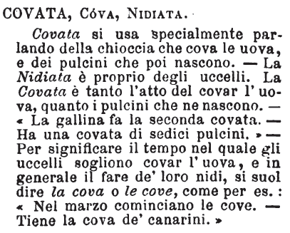 Covata, Cova, Nidiata - Covata si usa specialmente parlando della chioccia che cova le uova, e dei pulcini che poi nascono. - La Nidiata è proprio degli uccelli. la Covata è tanto l'atto del covar l'uova, quanto i pulcini che ne nascono. - « La gallina fa la seconda covata. - Ha una covata di sedici pulcini. » - Per significare il tempo nel quale gli uccelli sogliono covar l'uova, e in generale il fare de' loro nidi, si suol dire la cova o le cove, come per es.: « Nel marzo cominciano le cove. - Tiene la cova de' canarini. » [immagine]
