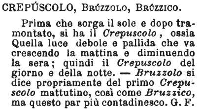 Crepuscolo, Bruzzolo, Bruzzico - Prima che sorga il sole e dopo tramontato, si ha il Crepuscolo, ossia Quella luce debole e pallida che va crescendo la mattina e diminuendo la sera; quindi il Crepuscolo del giorno e della notte. - Bruzzolo si dice propriamente del primo Crepuscolo mattutino, cosi come Bruzzico, ma questo par più contadinesco. G.F. [immagine]