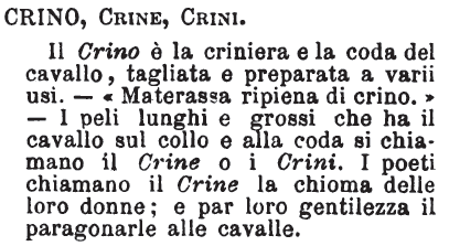 Crino, Crine, Crini - Il Crino è la criniera e la coda del cavallo, tagliata e preparata a varii usi. - «Materassa ripiena di crino.» - I peli lunghi e grossi che ha il cavallo sul collo e alla coda si chiamano il Crine o i Crini. I poeti chiamano il Crine la chioma delle loro donne; e par loro gentilezza il paragonarle alle cavalle. [immagine]