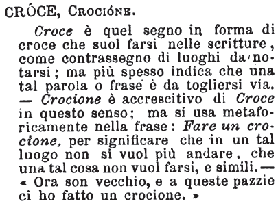 Croce, Crocione - Croce è quel segno in forma di croce che suol farsi nelle scritture, come contrassegno di luoghi da notarsi; ma più spesso indica che una tal parola o frase è da togliersi via. - Crocione è accrescitivo di Croce in questo senso; ma si usa metaforicamente nella frase: Fare un crocione, per significare che in un tal luogo non si vuol più andare, che una tal cosa non vuol farsi, e simili. - « Ora son vecchio, e a queste pazzie ci ho fatto un crocione. » [immagine]