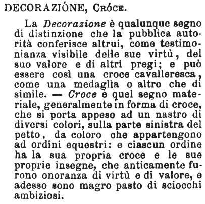 Decorazione, Croce - La Decorazione è qualunque segno di distinzione che la pubblica autorità conferisce altrui, come testimonianza visibile delle sue virtù, del suo valore e di altri pregi; e può essere così una croce cavalleresca, come una medaglia o altro che di simile. - Croce è quel segno materiale, generalmente in forma di croce, che si porta appeso ad un nastro di diversi colori, sulla parte sinistra del petto, da coloro che appartengono ad ordini equestri: e ciascun ordine ha la sua propria croce e le sue proprie insegne, che anticamente furono onoranza di virtù e di valore, e adesso sono magro pasto di sciocchi ambiziosi. [immagine]