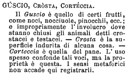 Guscio, Crosta, Corteccia - Il Guscio è quello di certi frutti, come noci, nocciuole, pinocchii, ecc.; e impropriamente l'involucro dove stanno chiusi gli animali detti crostacei e testacei. - Crosta è la superficie indurita di alcuna cosa. - Corteccia è quella del pane. L'uso spesso confonde tali voci, ma la proprietà è questa. I sensi metaforici non accade qui registrarli. [immagine]