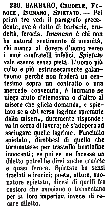 | Barbaro, Crudele, Feroce, Inumano, Spietato - Pei primi tre vedi il paragrafo precedente, ove è detto di barbarie, crudeltà, ferocia. Inumano è chi non ha natural sentimento di umanità, chi manca al dovere d'uomo verso i suoi confratelli infelici. Spietato vale essere senza pietà. L'uomo più colto e più estrinsecamente galantuomo perchè non froderà un centesimo sopra un contratto o una mercede convenuta, è inumano se niega aiuto d'elemosina o d'altro al misero che gliela domanda, e spietato se a chi versa lagrime spremute dalla miseria, duramente risponde: va in cerca di lavoro; nè s'adopera ad asciugare quelle lagrime. Fanciullo spietato, direbbesi di quello che tormentasse per trastullo bestioline innocenti; se poi se ne facesse un diletto potrebbe dirsi anche crudele e quasi feroce. Spietato ha sensi traslati e ironici; poeta, attore, suonatore spietato, dicesi di quelli fra costoro che annoiano o tormentano per la loro imperizia invece di recare diletto. [immagine] |