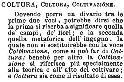 | Coltura, Cultura, Coltivazione - Dovendo porre un divario tra le prime due voci, potrebbe dirsi che la prima si riserba a significare quella de' campi, de' fiori; e la seconda quella metaforica dell'ingegno, la quale non si sostituirebbe con la voce Coltivazione, come si può far di Coltura; benchè per altro la Coltivazione si riferisca più specialmente alla teorica e all'atto del coltivare; e Coltura sia come il risultato di essa. [immagine] |