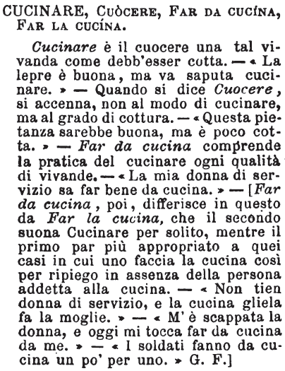Cucinare, Cuocere, Far da cucina, Far la cucina - Cucinare è il cuocere una tal vivanda come debb'esser cotta. - «La lepre è buona, ma va saputa cucinare.» - Quando si dice Cuocere, si accenna, non al modo di cucinare, ma al grado di cottura. - «Questa pietanza sarebbe buona, ma è poco cotta.» - Far da cucina comprende la pratica del cucinare ogni qualità di vivande. - «La mia donna di servizio sa far bene da cucina.» - [Far da cucina, poi, differisce in questo da Far la cucina, che il secondo suona Cucinare per solito, mentre il primo par più appropriato a quei casi in cui uno faccia la cucina così per ripiego in assenza della persona addetta alla cucina. - «Non tien donna di servizio, e la cucina gliela fa la moglie.» - «M'è scappata la donna, e oggi mi tocca far da cucina da me.» - «I soldati fanno da cucina un po' per uno.» G. F.] [immagine]