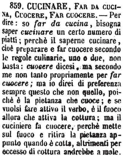 Cucinare, Far da cucina, Cuocere, Far cuocere - Per dire: so far da cucina, bisogna saper cucinare un certo numero di piatti; perchè il saperne cucinare, cioè preparare e far cuocere secondo le regole culinarie, uno o due, non basta: cuocere dicesi, ma secondo me non tanto propriamente per far cuocere; ma io direi di preferenza sempre questo che non quello, poichè è la pietanza che cuoce; e se vuolsi fare attivo il verbo, è il fuoco allora che attiva la cottura; ma il cuciniere fa cuocere, perchè mette sul fuoco e ritira la pietanza appunto quando è cotta, altrimenti per eccesso di cottura andrebbe a male. [immagine]
