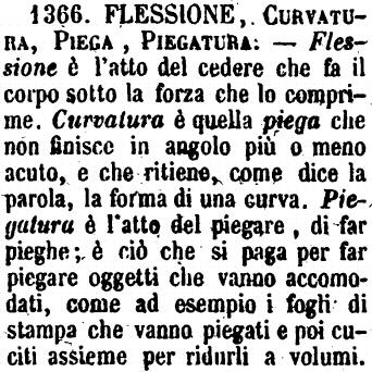 | Flessione, Curvatura, Piega, Piegatura - Flessione è l'atto del cedere che fa il corpo sotto la forza che lo comprime. Curvatura è quella piega che non finisce in angolo più o meno acuto, e che ritiene, come dice la parola, la forma di una curva. Piegatura è l'atto del piegare, di far pieghe; è ciò che si paga per far piegare oggetti che vanno accomodati, come ad esempio i fogli di stampa che vanno piegati e poi cuciti assieme per ridurli a volumi. [immagine] |