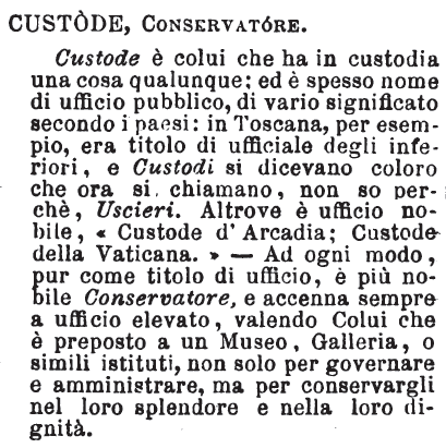 | Custode, Conservatore - Custode è colui che ha in custodia una cosa qualunque; ed è spesso nome di ufficio pubblico, di vario significato secondo i paesi: in Toscana, per esempio, era titolo di ufficiale degli inferiori, e Custodi si dicevano coloro che ora si chiamano, non so perchè, Uscieri. Altrove è ufficio nobile, «Custode d'Arcadia; Custode della Vaticana.» - Ad ogni modo, pur come titolo di ufficio, è più nobile Conservatore, e accenna sempre a ufficio elevato, valendo Colui che è preposto a un Museo, Galleria, o simili istituti, non solo per governare e amministrare, ma per conservargli nel loro splendore e nella loro dignità. [immagine] |