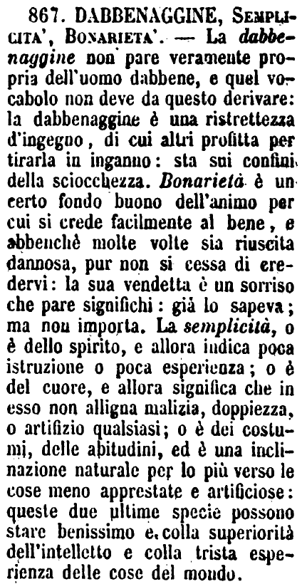 | Dabbenaggine, Minchionaggine, Coglionaggine - Benchè Dabbenaggine venga da Uomo da bene, che è lode, pure si usa sempre ironicamente a significare persona così credula che si inganna e si lascia ingannare, sicchè fa e dice delle assurde e false cose, reputandole vere. - Minchionaggine è qualcosa di più: è difetto di accortezza naturale e di senso comune, per la quale altri fa cose o assurde o dannose anche a sè stesso. - [Aggiungo qui la Coglionaggine, non tanto per dire, come sinonimista, che è più grave delle altre due; ma per assennare i non toscani che tutta la famiglia di questa voce è per noi volgarissima, anzi plebeissima, e che non è mai usata da persone ben educate. Qualcuno riderà di questa mia osservazione, reputandola superflua; ma io non la reputo tale, dopo che ho dovuto farla a qualche pezzo grossissimo che la pretendeva a' toscanesimi e a un Professore d'italiano che lasciava usare, e forse consigliava, le coglionerie e famiglia alle sue allieve del Conservatorio di.... Ora la facevo bella davvero! G. F.] [immagine] |