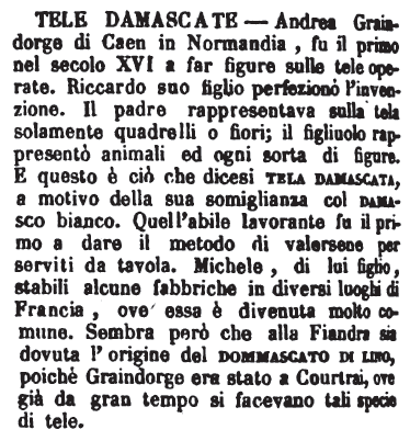 | Tele damascate - Andrea Graindorge di Caen in Normandia, fu il primo nel secolo XVI a far figure sulle tele operate. Riccardo suo figlio perfezionò l'invenzione. Il padre rappresentava sulla tela solamente quadrelli o fiori; il figliuolo rappresentò animali ed ogni sorta di figure. E questo è ciò che dicesi tela damascata, a motivo della sua somiglianza col damasco bianco. Quell'abile lavorante fu il primo a dare il metodo di valersene per serviti da tavola. Michele, di lui figlio, stabili alcune fabbriche in diversi luoghi di Francia, ove essa è divenuta molto comune. Sembra però che alla Fiandra sia dovuta l'origine del dommascato di lino, poichè Graindorge era stato a Courtrai, ove già da gran tempo si facevano tali specie di tele. [immagine] |