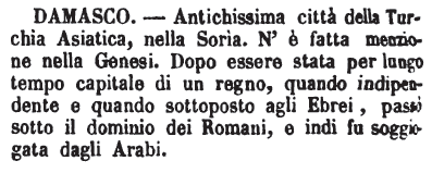 | Damasco - Antichissima città della Turchia Asiatica, nella Sorìa. N'è fatta menzione nella Genesi. Dopo essere stata per lungo tempo capitale di un regno, quando indipendente e quando sottoposto agli Ebrei, passò sotto il dominio dei Romani, e indi fu soggiogata dagli Arabi. [immagine] |