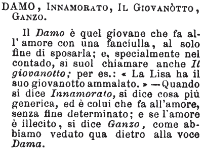 | Damo, Innamorato, Il giovanotto, Ganzo - Il Damo è quel giovane che fa all'amore con una fanciulla, al solo fine di sposarla; e, specialmente nel contado, si suol chiamare anche Il giovanotto; per es.: «La Lisa ha il suo giovanotto ammalato.» - Quando si dice Innamorato, si dice cosa più generica, ed è colui che fa all'amore, senza fine determinato; e se l'amore è illecito, si dice Ganzo, come abbiamo veduto qua dietro alla voce Dama. [immagine] |