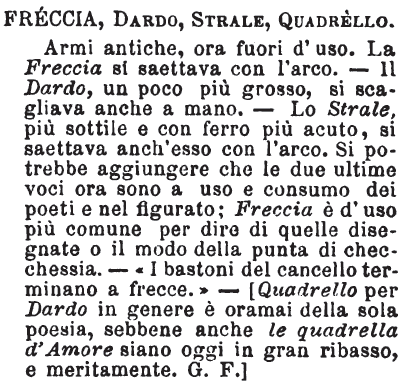 | Freccia, Dardo, Strale, Quadrello - Armi antiche, ora fuori d'uso. La Freccia si saettava con l'arco. - Il Dardo, un poco più grosso, si scagliava anche a mano. - Lo Strale, più sottile e con ferro più acuto, si saettava anch'esso con l'arco. Si potrebbe aggiungere che le due ultime voci ora sono a uso e consumo dei poeti e nel figurato; Freccia è d'uso più comune per dire di quelle disegnate o il modo della punta di checchessia. - «I bastoni del cancello terminano a frecce.» - [Quadrello per Dardo in genere è oramai della sola poesia, sebbene anche le quadrella d'Amore siano oggi in gran ribasso, e meritamente. G. F.] [immagine] |