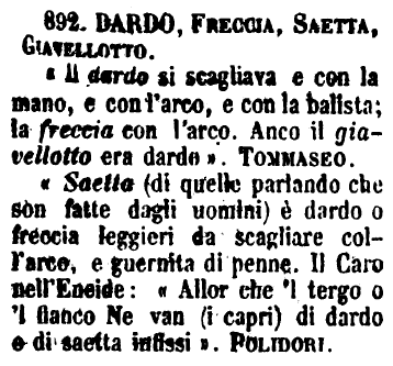 | Dardo, Freccia, Saetta, Giavellotto - «Il dardo si scagliava e con la mano, e con l'arco, e con la balista; la freccia con l'arco. Anco il giavellotto era dardo». Tommaseo.