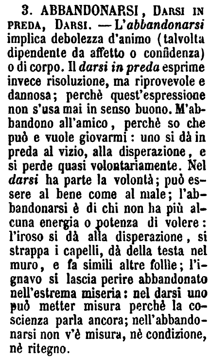 | Abbandonarsi, Darsi in preda, Darsi - L'abbandonarsi implica debolezza d'animo (talvolta dipendente da affetto o confidenza) o di corpo. Il darsi in preda esprime invece risoluzione, ma riprovevole e dannosa; perchè quest'espressione non s'usa mai in senso buono. M'abbandono all'amico, perchè so che può e vuole giovarmi: uno si dà in preda al vizio, alla disperazione, e si perde quasi volontariamente. Nel darsi ha parte la volontà; può essere al bene come al male; l'abbandonarsi è di chi non ha più alcuna energia o potenza di volere: l'iroso si dà alla disperazione, si strappa i capelli, dà della testa nel muro, e fa simili altre follìe; l'ignavo si lascia perire abbandonato nell'estrema miseria: nel darsi uno può metter misura perchè la coscienza parla ancora; nell'abbandonarsi non v'è misura, nè condizione, nè ritegno. [immagine] |