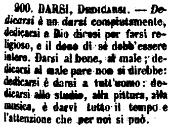 | Darsi, Dedicarsi - Dedicarsi è un darsi compiutamente, dedicarsi a Dio dicesi per farsi religioso, e il dono di sè debb'essere intero. Darsi al bene, al male; dedicarsi al male pare non si direbbe: dedicarsi è darsi a tutt'uomo: dedicarsi allo studio, alla pittura, alla musica, è darvi tutto il tempo e l'attenzione che per noi si può. [immagine] |