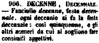 Decenne, Decennale - Fanciullo decenne, festa decennale. ogni decennio si fa la festa decennale: così quinquenne, e gli altri numeri da cui si sogliono fare consimili aggettivi. [immagine]