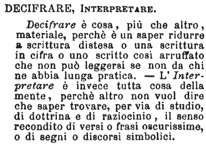 Decifrare, Interpretare - Decifrare è cosa, più che altro, materiale, perchè è un saper ridurre a scrittura distesa o una scrittura in cifra o uno scritto così arruffato che non può leggersi se non da chi ne abbia lunga pratica. - L'Interpretare è invece tutta cosa della mente, perchè altro non vuol dire che saper trovare, per via di studio, di dottrina e di raziocinio, il senso recondito di versi o frasi oscurissime, o di segni o discorsi simbolici. [immagine]