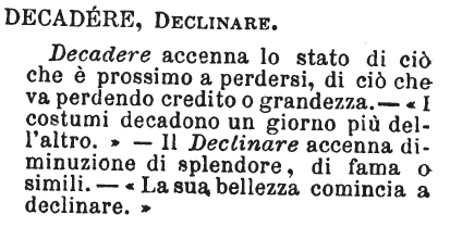 | Decadere, Declinare - Decadere accenna lo stato di ciò che è prossimo a perdersi, di ciò che va perdendo credito o grandezza. - « I costumi decadono un giorno più dell'altro.» - Il Declinare accenna diminuzione di splendore, di fama o simili. - « La sua bellezza comincia a declinare.» [immagine] |