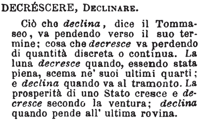 | Decrescere, Declinare - Ciò che declina, dice il Tommaseo, va pendendo verso il suo termine; cosa che decresce va perdendo di quantità discreta o continua. La luna decresce quando, essendo stata piena, scema ne' suoi ultimi quarti; e declina quando va al tramonto. La prosperità di uno Stato cresce e decresce secondo la ventura; declina quando pende all'ultima rovina. [immagine] |