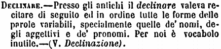 | Declinare - Presso gli antichi il declinare valeva recitare di seguito ed in ordine tutte le forme delle parole variabili, specialmente quelle de' nomi, degli aggettivi e de' pronomi. Per noi è vocabolo inutile. - (V. Declinazione). [immagine] |