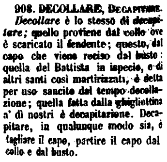 | Decollare, Decapitare - Decollare è lo stesso di decapitare; quello proviene dal collo ove è scaricato il fendente; questo, dal capo che viene reciso dal busto: quella del Battista in ispecie, e di altri santi così martirizzati, è detta per uso sancito dal tempo decollazione; quella fatta dalla ghigliottina a' dì nostri è decapitazione. Decapitare, in qualunque modo sia, è tagliare il capo, partire il capo dal collo e dal busto. [immagine] |