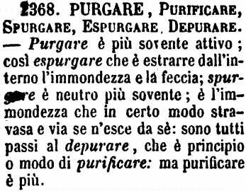 | Purgare, Purificare, Spurgare, Espurgare, Depurare - Purgare è più sovente attivo; così espurgare che è estrarre dall'interno l'immondezza e la feccia; spurgare è neutro più sovente; è l'immondezza che in certo modo stravasa e via se n'esce da sè: sono tutti passi al depurare, che è principio o modo di purificare: ma purificare è più. [immagine] |