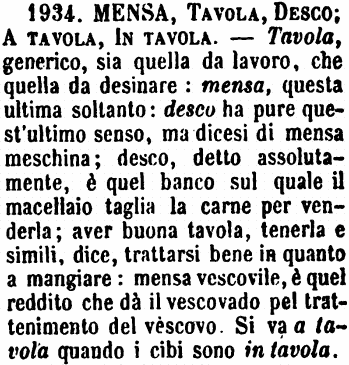 | Mensa, Tavola, Desco; A tavola, In tavola - Tavola, generico, sia quella da lavoro, che quella da desinare: mensa, questa ultima soltanto: desco ha pure quest'ultimo senso, ma dicesi di mensa meschina; desco, detto assolutamente, è quel banco sul quale il macellaio taglia la carne per venderla; aver buona tavola, tenerla e simili, dice, trattarsi bene in quanto a mangiare: mensa vescovile, è quel reddito che dà il vescovado pel trattenimento del vescovo. Si va a tavola quando i cibi sono in tavola. [immagine] |