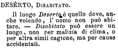| Deserto, Disabitato - Il luogo Deserto è quello dove, anche volendo, l'uomo non può abitare. - Disabitato può essere un luogo, non per malizia di clima, o per altra simil cagione, ma per cause accidentali. [immagine] |