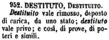 | Usando "destituito" (*) si possono ottenere i seguenti risultati: * precostituito = depreco; * voto = destituivo; * remoto = destituiremo. |