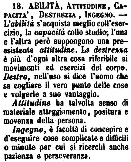 Abilità, Attitudine, Capacità, Destrezza, Ingegno - L'abilità s'acquista meglio coll'esercizio, la capacità collo studio; l'una e l'altra però suppongono una preesistente attitudine. La destrezza è più d'ogni altra cosa riferibile ai movimenti ed esercizi del corpo. Destro, nell'uso si dice l'uomo che sa cogliere il vero punto delle cose e volgerle a suo vantaggio.