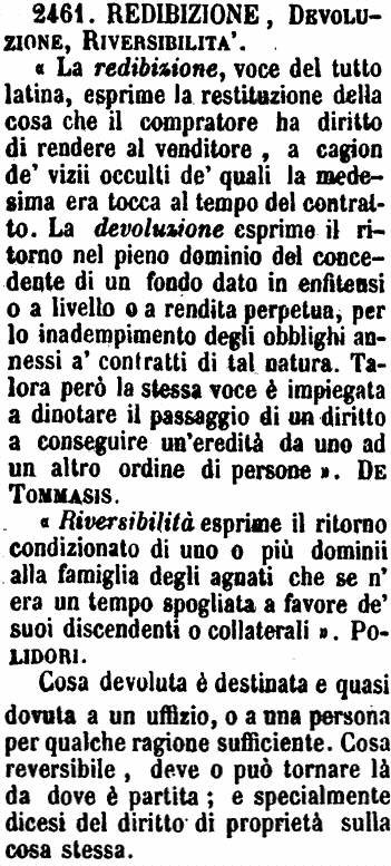 | Redibizione, Devoluzione, Riversibilità - «La redibizione, voce del tutto latina, esprime la restituzione della cosa che il compratore ha diritto di rendere al venditore, a cagion de' vizii occulti de' quali la medesima era tocca al tempo del contratto. La devoluzione esprime il ritorno nel pieno dominio del concedente di un fondo dato in enfiteusi o a livello o a rendita perpetua, per lo inadempimento degli obblighi annessi a' contratti di tal natura. Talora però la stessa voce è impiegata a dinotare il passaggio di un diritto a conseguire un'eredità da uno ad un altro ordine di persone». De Tommasis.
