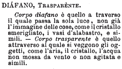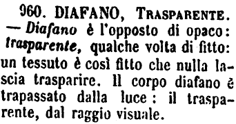 Diafano, Trasparente - Diafano è l'opposto di opaco: trasparente, qualche volta di fitto: un tessuto è così fitto che nulla lascia trasparire. Il corpo diafano è trapassato dalla luce: il trasparente, dal raggio visuale. [immagine]