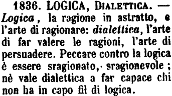 | Logica, Dialettica - Logica, la ragione in astratto, e l'arte di ragionare: dialettica, l'arte d far valere le ragioni, l'arte di persuadere. Peccare contro la logica è essere sragionato, sragionevole; nè vale dialettica a far capace chi non ha in capo fil di logica. [immagine] |