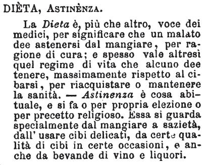Dieta, Astinenza - La Dieta è, più che altro, voce dei medici, per significare che un malato dee astenersi dal mangiare, per ragione di cura; e spesso vale altresì quel regime di vita che alcuno dee tenere, massimamente rispetto al cibarsi, per riacquistare o mantenere la sanità. - Astinenza è cosa abituale, e si fa o per propria elezione o per precetto religioso. Essa si guarda specialmente dal mangiare a sazietà, dall'usare cibi delicati, da certe qualità di cibi in certe occasioni, e anche da bevande di vino e liquori. [immagine]