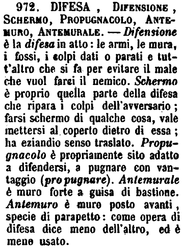 | Difesa, Difensione, Schermo, Propugnacolo, Antemuro, Antemurale - Difensione è la difesa in atto: le armi, le mura, i fossi, i colpi dati o parati e tutt'altro che si fa per evitare il male che vuol farci il nemico. Schermo è proprio quella parte della difesa che ripara i colpi dell'avversario; farsi schermo di qualche cosa, vale mettersi al coperto dietro di essa; ha eziandio senso traslato. Propugnacolo è propriamente sito adatto a difendersi, a pugnare con vantaggio (propugnare). Antemurale è muro forte a guisa di bastione. Antemuro è muro posto avanti, specie di parapetto: come opera di difesa dice meno dell'altro, ed è meno usato. [immagine] |