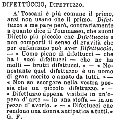 Difettuccio, Difettuzzo - A' Toscani è più comune il primo, anzi non usano che il primo. Difettuzzo a me pare però, contrariamente a quanto dice il Tommaseo, che suoni Difetto più piccolo che Difettuccio e non comporti il senso di gravità che per eufemismo può aver Difettuccio. - «Uomo pieno di difettucci - che ha i suoi difettucci - che ne ha molti - brutti difettucci.» - «Nonostante quel difettuzzo è un uomo di gran merito e amato da tutti.» - «Non so scorgere nella vostra poesia che un piccolo difettuzzo.» - «Difettuzzo appena visibile in un'opera d'arte - in una stoffa - in un pezzo d'avorio.» - «Difettucci che rendono una donna antipatica a tutti.» G. F. [immagine]