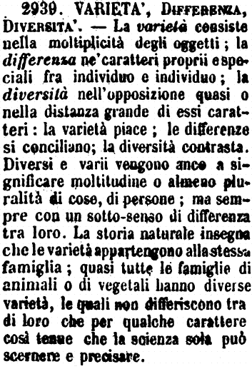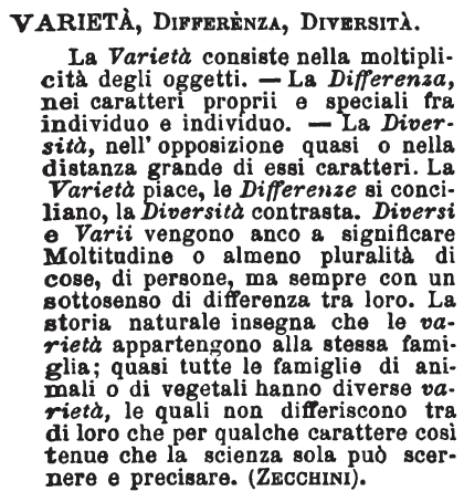 Varietà, Differenza, Diversità - La Varietà consiste nella moltiplicità degli oggetti. - La Differenza, nei caratteri proprii e speciali fra individuo e individuo. - La Diversità, nell'opposizione quasi o nella distanza grande di essi caratteri. La Varietà piace, le Differenze si conciliano, la Diversità contrasta. Diversi e Varii vengono anco a significare Moltitudine o almeno pluralità di cose, di persone, ma sempre con un sottosenso di differenza tra loro. La storia naturale insegna che le varietà appartengono alla stessa famiglia; quasi tutte le famiglie di animali o di vegetali hanno diverse varietà, le quali non differiscono tra di loro che per qualche carattere così tenue che la scienza sola può scernere e precisare. (Zecchini). [immagine]