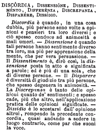 Discordia, Dissensione, Dissentimento, Differenza, Discrepanza, Disparere, Dissidio - Discordia è quando, in una cosa dubbia, più persone sono volte a opinioni e pensieri tra loro diversi; e ciò spesso conduce ad animosità e mali umori. - Dissensione è quando tali persone hanno sentimento diverso tra loro, ma più per apprensione della mente, che per vera persuasione. - Il Dissentimento è, dirò così, la dissensione posta in atto e significata a parole; ed è più di una sola, che di diverse persone. - Il Disparere è diversità di giudizio tra più persone, che spesso degenera in animosità. - La Discrepanza è tanto delle opinioni quanto de' sentimenti; e spesso cade, più che altro, nell'applicazione pratica delle opinioni significate. - Dissidio è lo scostarsi dall'opinione altrui, rompendo la precedente concordia, quasi andando a sedere in luogo contrario, come par che suoni la voce. [immagine]