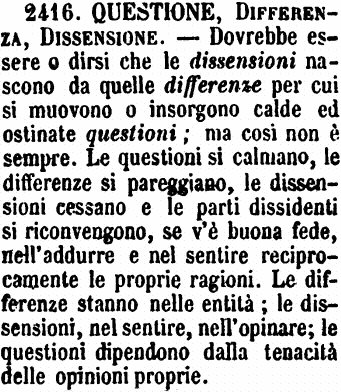 Questione, Differenza, Dissensione - Dovrebbe essere o dirsi che le dissensioni nascono da quelle differenze per cui si muovono o insorgono calde ed ostinate questioni; ma così non è sempre. Le questioni si calmano, le differenze si pareggiano, le dissensioni cessano e le parti dissidenti si riconvengono, se v'è buona fede, nell'addurre e nel sentire reciprocamente le proprie ragioni. Le differenze stanno nelle entità; le dissensioni, nel sentire, nell'opinare; le questioni dipendono dalla tenacità delle opinioni proprie. [immagine]
