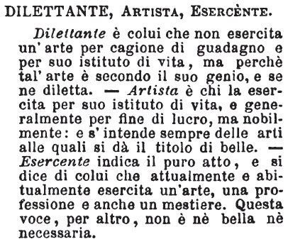 | Dilettante, Artista, Esercente - Dilettante è colui che non esercita un'arte per cagione di guadagno e per suo istituto di vita, ma perchè tal'arte è secondo il suo genio, e se ne diletta. - Artista è chi la esercita per suo istituto di vita, e generalmente per fine di lucro, ma nobilmente: e s'intende sempre delle arti alle quali si dà il titolo di belle. - Esercente indica il puro atto, e si dice di colui che attualmente e abitualmente esercita un'arte, una professione e anche un mestiere. Questa voce, per altro, non è nè bella nè necessaria. [immagine] |