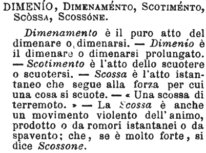 | Dimenio, Dimenamento, Scotimento, Scossa, Scossone - Dimenamento è il puro atto del dimenare o dimenarsi. - Dimenío è il dimenare o dimenarsi prolungato. - Scotimento è l'atto dello scuotere o scuotersi. - Scossa è l'atto istantaneo che segue alla forza per cui una cosa si scuote. - « Una scossa di terremoto. » - La Scossa è anche un movimento violento dell'animo, prodotto o da romori istantanei o da spavento; che, se è molto forte, si dice Scossone. [immagine] |