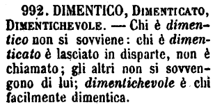 Dimentico, Dimenticato, Dimentichevole - Chi è dimentico non si sovviene: chi è dimenticato è lasciato in disparte, non è chiamato; gli altri non si sovvengono di lui; dimentichevole è chi facilmente dimentica. [immagine]