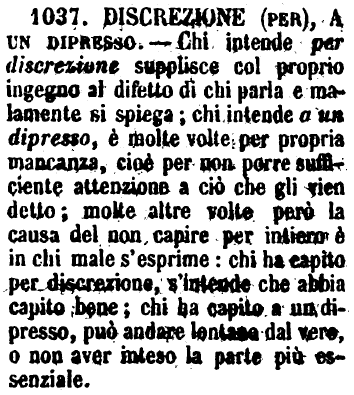 | Discrezione (per), A un dipresso - Chi intende per discrezione supplisce col proprio ingegno al difetto di chi parla e malamente si spiega; chi intende a un dipresso, è molte volte per propria mancanza, cioè per non porre sufficiente attenzione a ciò che gli vien detto; molte altre volte però la causa del non capire per intiero è in chi male s'esprime: chi ha capito per discrezione, s'intende che abbia capito bene; chi ha capito a un dipresso, può andare lontano dal vero, o non aver inteso la parte più essenziale. [immagine] |