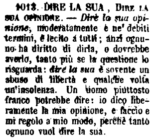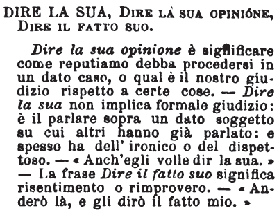 | Dire la sua, Dire la sua opinione, Dire il fatto suo - Dire la sua opinione è significare come reputiamo debba procedersi in un dato caso, o qual è il nostro giudizio rispetto a certe cose. - Dire la sua non implica formale giudizio: è il parlare sopra un dato soggetto su cui altri hanno già parlato: e spesso ha dell'ironico o del dispettoso. - «Anch'egli volle dir la sua.» - La frase Dire il fatto suo significa risentimento o rimprovero. - «Anderò là, e gli dirò il fatto mio.» [immagine] |