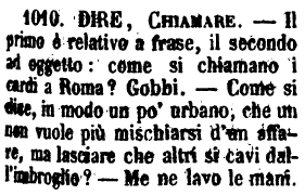 | Dire, Chiamare - Il primo è relativo a frase, il secondo ad oggetto: come si chiamano i cardi a Roma? Gobbi. - Come si dice, in modo un po' urbano, che un non vuole più mischiarsi d'un affare, ma lasciare che altri si cavi dall'imbroglio? - Me ne lavo le mani. [immagine] |