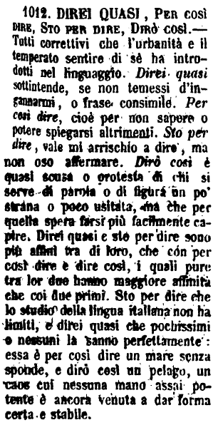 | Direi quasi, Per così dire, Sto per dire, Dirò così - Tutti correttivi che l'urbanità e il temperato sentire di sè ha introdotti nel linguaggio. Direi quasi sottintende, se non temessi d'ingannarmi, o frase consimile. Per così dire, cioè per non sapere o potere spiegarsi altrimenti. Sto per dire, vale mi arrischio a dire, ma non oso affermare. Dirò così è quasi scusa o protesta di chi si serve di parola o di figura un po' strana o poco usitata, ma che per quella spera farsi più facilmente capire. Direi quasi e sto per dire sono più affini tra di loro, che con per così dire e dire così, i quali pure tra lor due hanno maggiore affinità che coi due primi. Sto per dire che lo studio della lingua italiana non ha limiti, e direi quasi che pochissimi o nessuni la sanno perfettamente: essa è per così dire un mare senza sponde, e dirò così un pelago, un caos cui nessuna mano assai potente è ancora venuta a dar forma certa e stabile. [immagine] |