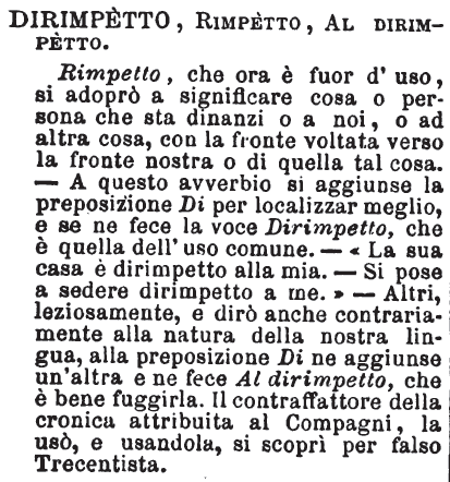 Dirimpetto, Rimpetto, Al dirimpetto - Rimpetto, che ora è fuor d'uso, si adoprò a significare cosa o persona che sta dinanzi o a noi, o ad altra cosa, con la fronte voltata verso la fronte nostra o di quella tal cosa. - A questo avverbio si aggiunse la preposizione Di per localizzar meglio, e se ne fece la voce Dirimpetto, che è quella dell'uso comune. - «La sua casa è dirimpetto alla mia. - Si pose a sedere dirimpetto a me.» - Altri, leziosamente, e dirò anche contrariamente alla natura della nostra lingua, alla preposizione Di ne aggiunse un'altra e ne fece Al dirimpetto, che è bene fuggirla. Il contraffattore della cronica attribuita al Compagni, la usò, e usandola, si scoprì per falso Trecentista. [immagine]