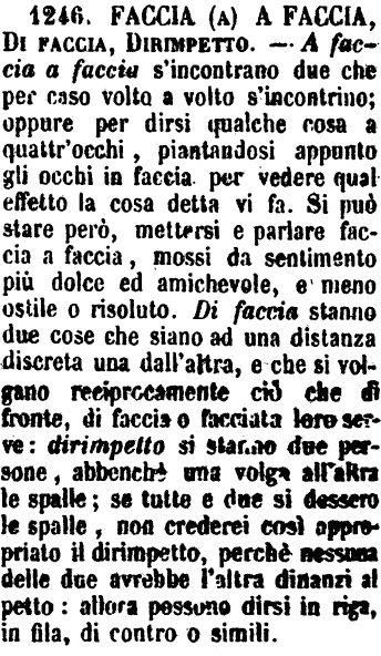 Faccia (a) a faccia, Alla presenza, Di faccia, Dirimpetto, A faccia, A viso - A faccia a faccia si dice di due persone che si trovano l'una dirimpetto all'altra e molto vicine. - Alla presenza non è reciproco, ma vale l'essere una persona dinanzi ad un'altra, o per chieder qualcosa o per dir sue ragioni o per fare checchessia. - Di faccia si suol dire di cosa materiale che sia dinanzi ad un'altra di simile qualità e che abbia larga superficie. - «Sta nella casa di faccia alla mia.» - Dirimpetto vale lo stesso, ma si dice di qualunque cosa, e forse accenna distanza minore. - A faccia e A viso valgono l'istesso, salvo che A faccia è più efficace, ed è usitato specialmente dove si parli di cose da dirsi o da confermarsi senza riguardi e senza paura. - «Io l'ho detto lui, e glielo mantengo a faccia. - Io glielo dico a viso: questa cosa non istà bene.» [immagine]